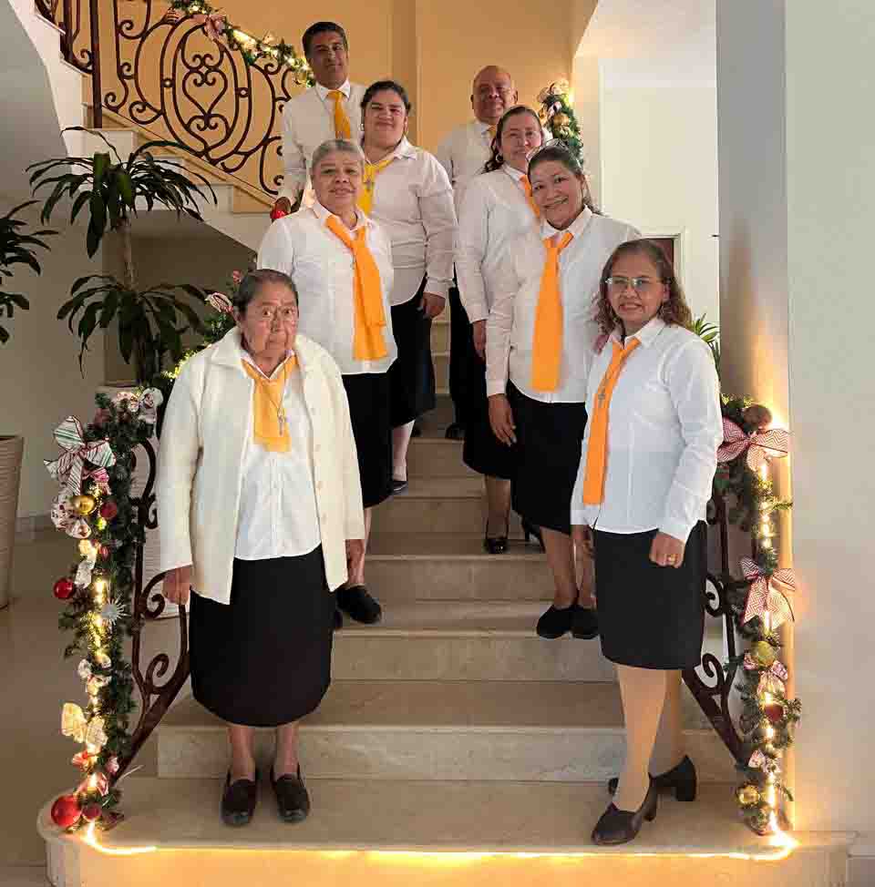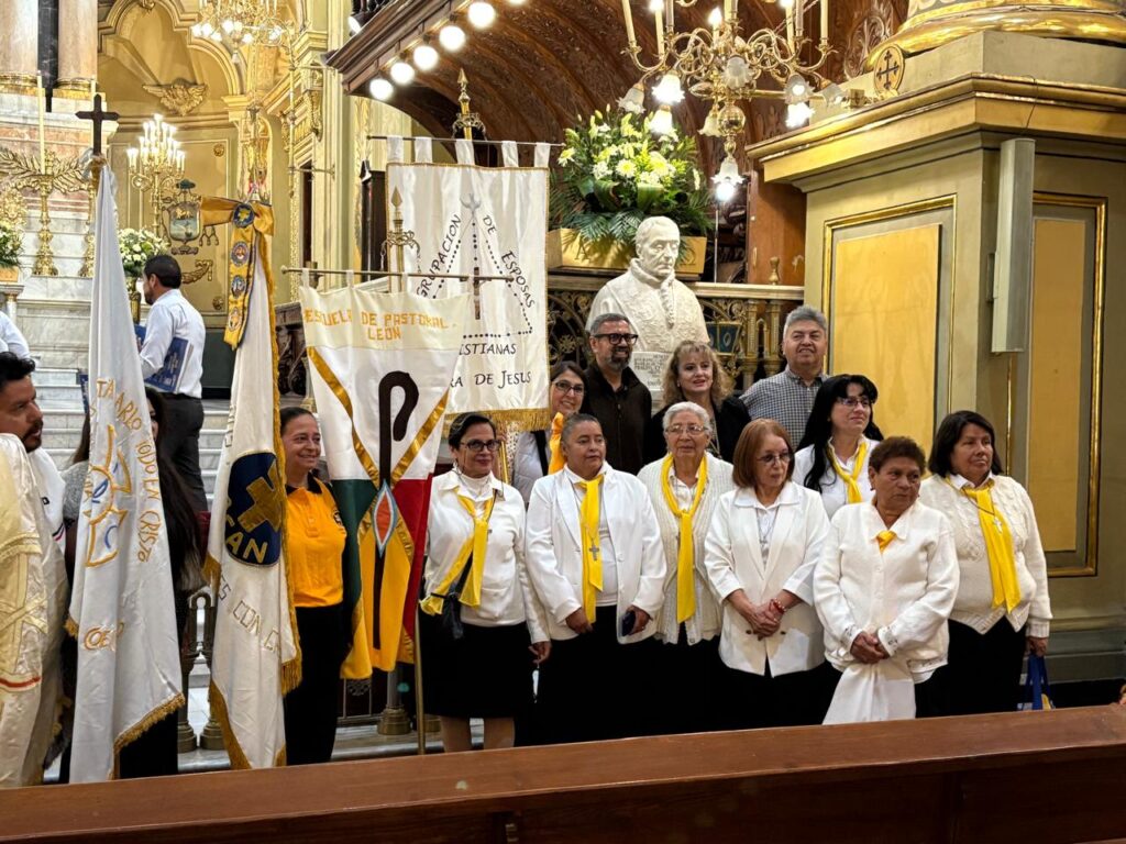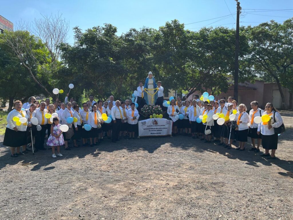 Nuestras hermanas de León aparecen en esta fotografía. En el lado izquierdo, al centro, se encuentra Azucena Jiménez, colectora regional; junto a ella, sosteniendo la bandera, está Georgina Jáuregui, encargada de la Región León. Del lado derecho, la más bajita es Mago, esposa de Lencho. La imagen corresponde al Rosario Viviente realizado en León y organizado por DILAIC. Ese día la indicación fue asistir en negro y blanco, razón por la cual no llevan uniforme.